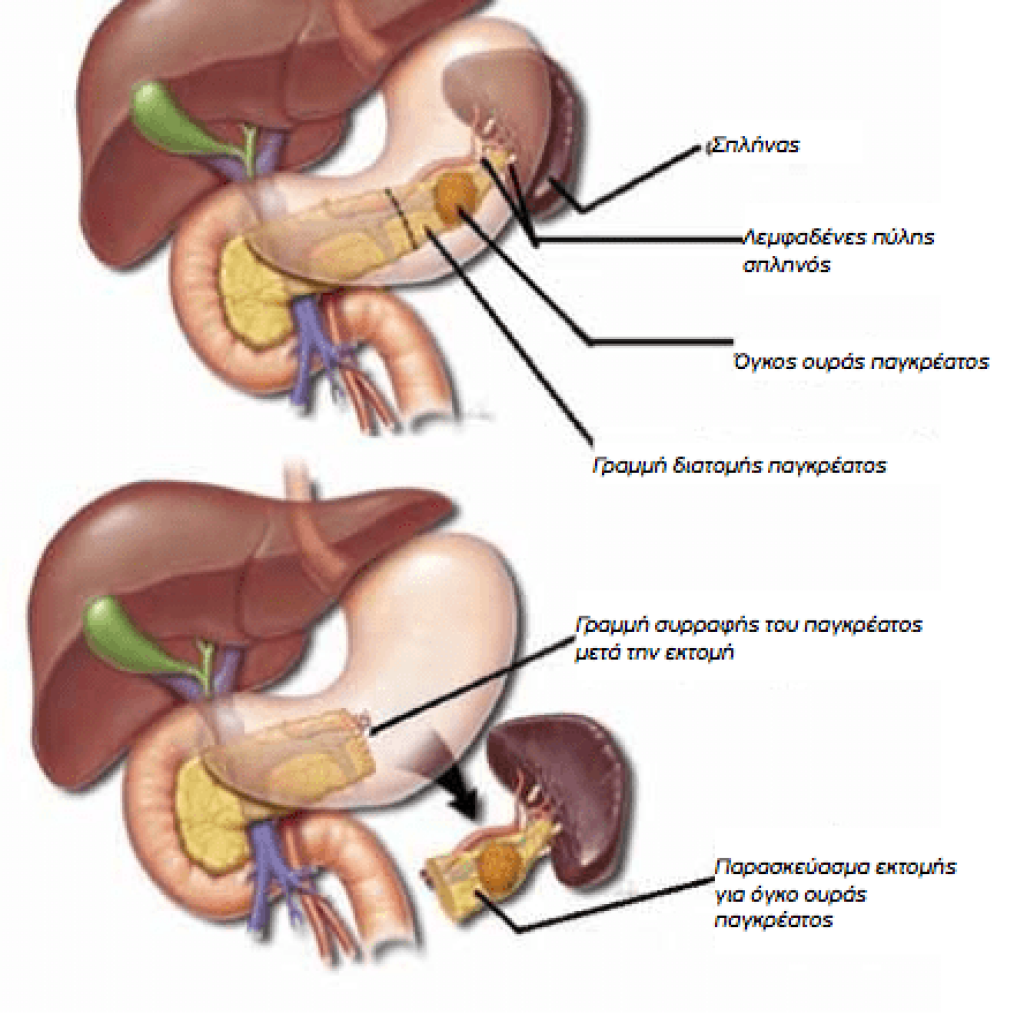 Για όγκους που αντιμετωπίζονται στο σώμα και την ουρά του παγκρέατος απαιτείται η εκτομή του αντίστοιχου τμήματος του οργάνου καθώς και σπληνεκτομή.