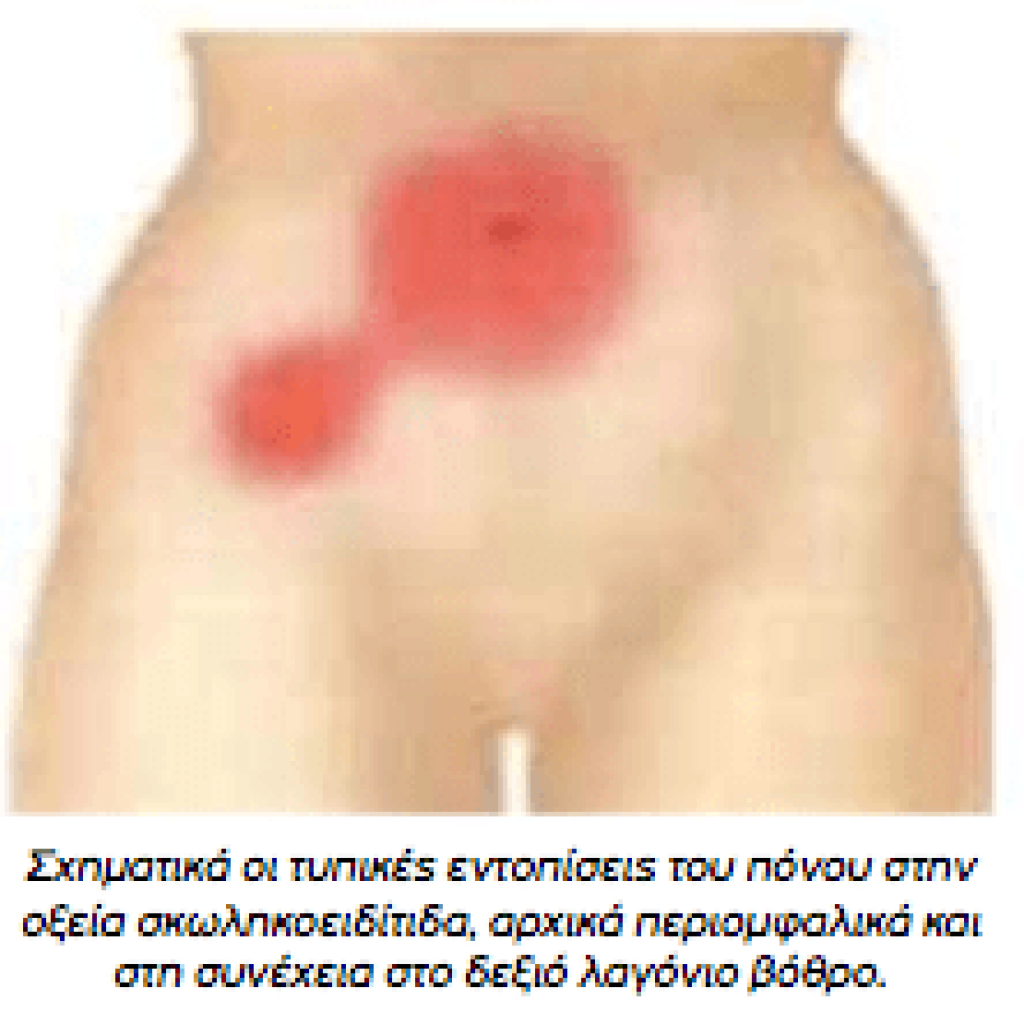 Περιγράφοντας μια τυπική κλινική εικόνα θα λέγαμε ότι ο ασθενής παραπονείται αρχικά για ένα ακαθόριστο άλγος γύρω από τον ομφαλό, το οποίο μπορεί να διαλάθει της προσοχής του και να αποδοθεί σε κολικό εντέρου ή δυσπεψία ή κάποια άνευ σημασίας ενόχληση. Στη συνέχεια όμως, εντός λίγων ωρών, ο πόνος αλλάζει θέση και σταθεροποιείται στη δεξιά κάτω κοιλία (δεξιός λαγόνιος βόθρος) αποκτώντας σαφείς χαρακτήρες.